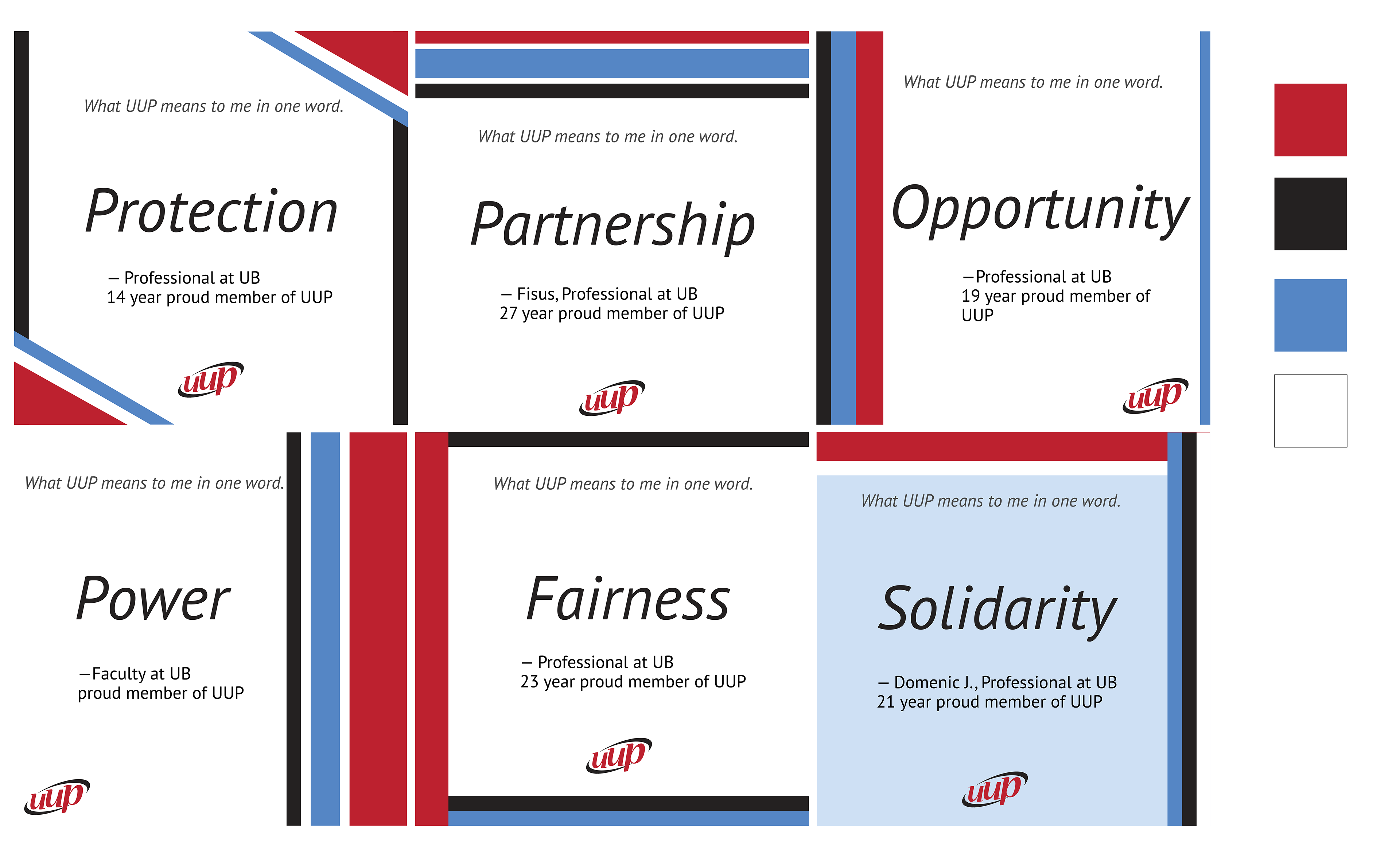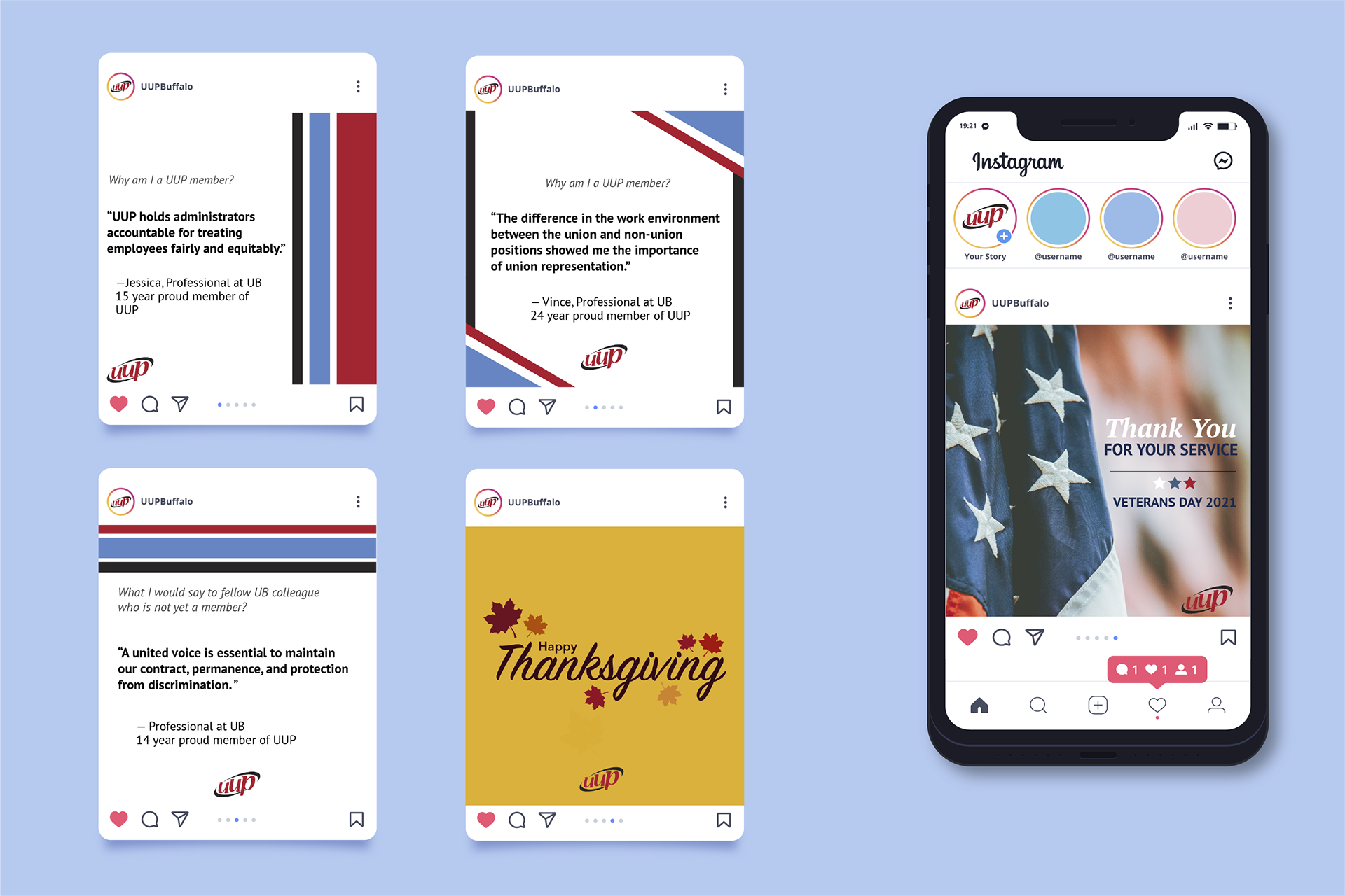 UUP Buffalo is one of the largest unions (UUP) in New York State representing all full- and part-time faculty and professional staff at the University at Buffalo. I created a social media campaign to increase engagement from their followers and reach potential UUP members to sign up. This campaign obtained information from current UUP members in a questionnaire focusing on their experiences with UUP. I wanted current and potential UUP members to feel a sense of community even within social media. I designed clean graphics that both that work along with content and UUP's established brand identity.