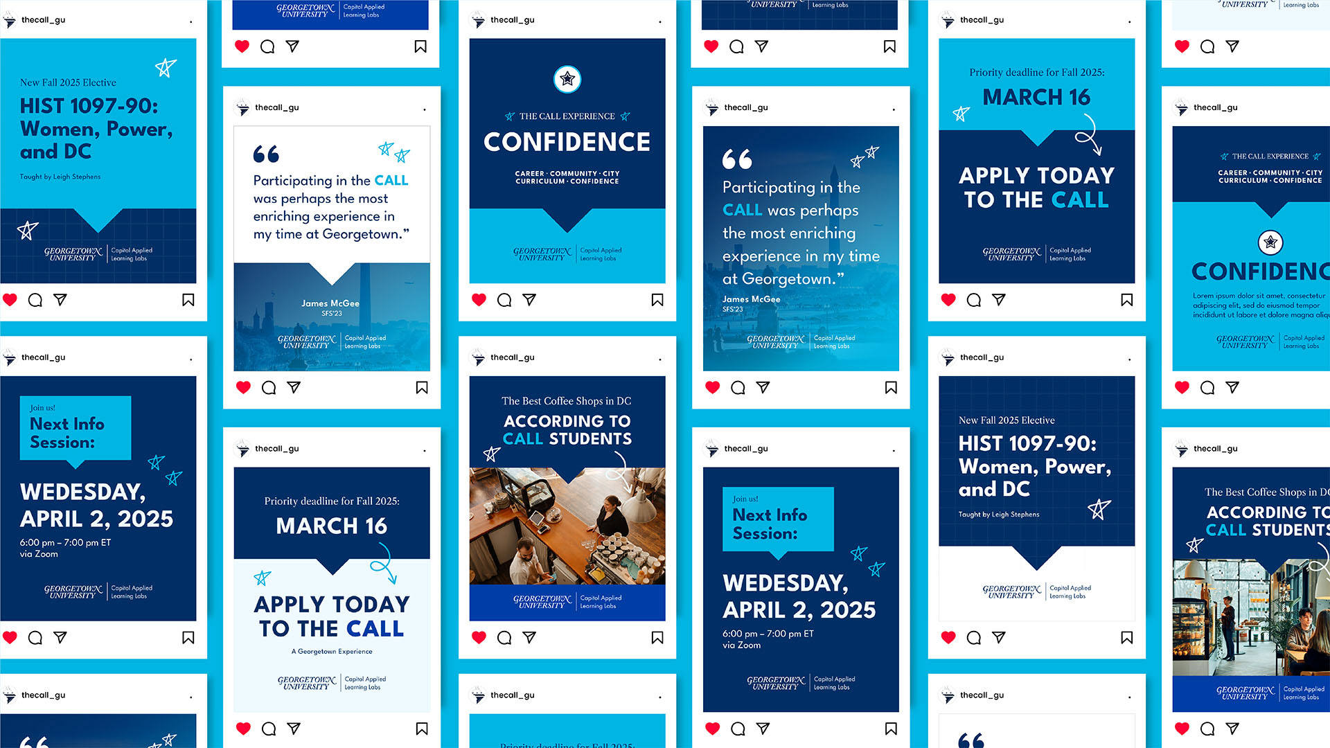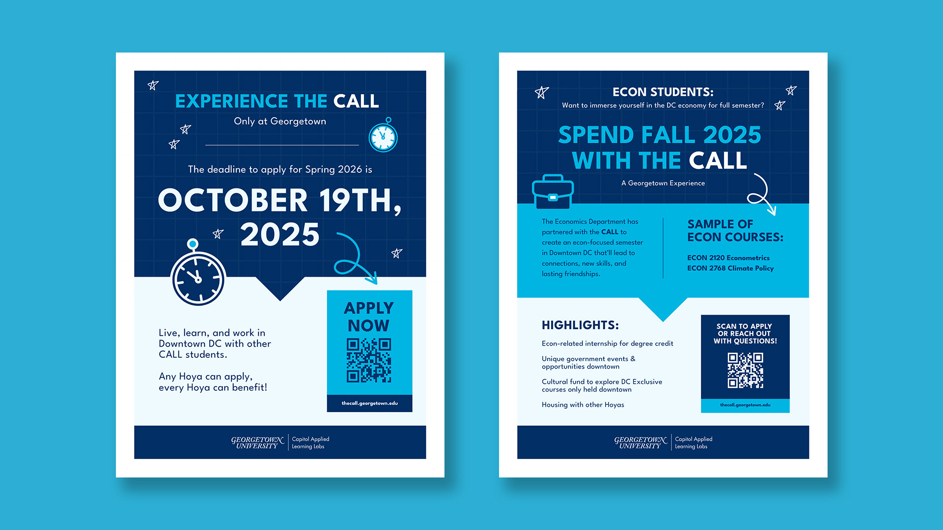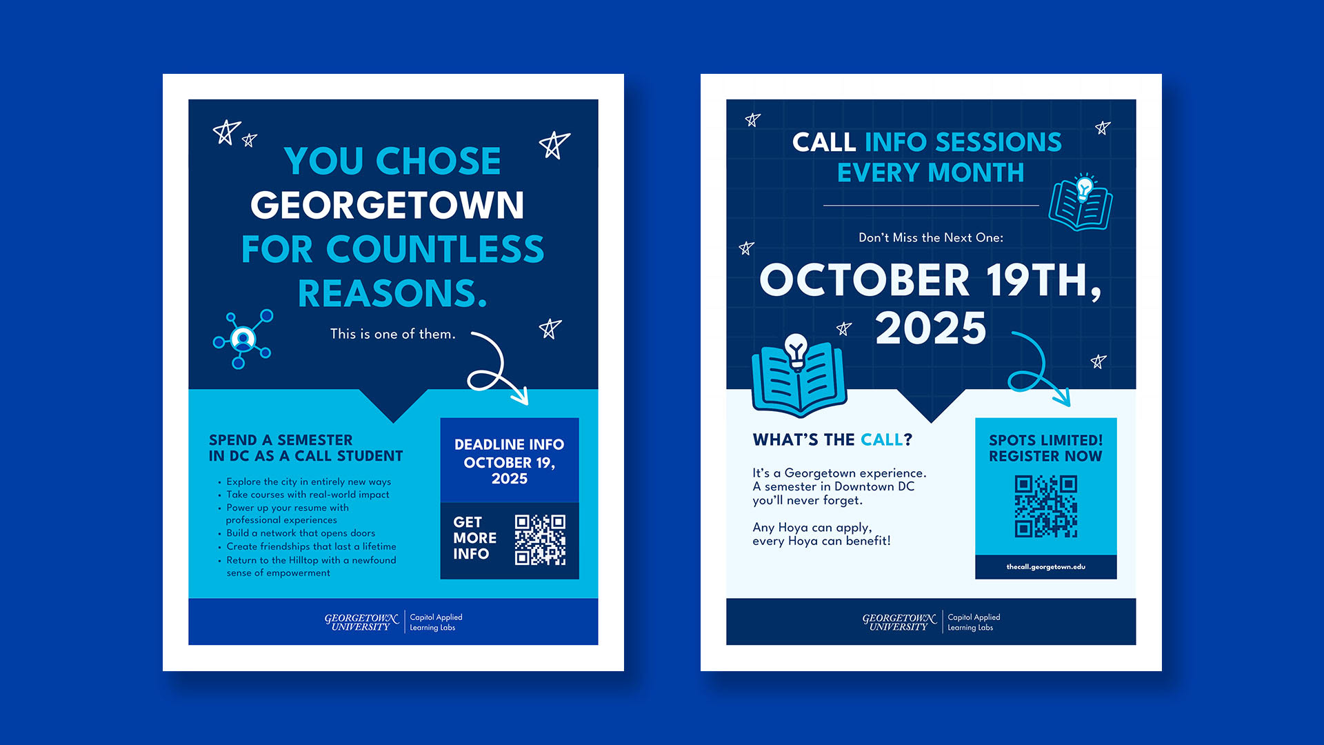 Georgetown University's The CALL requested assistance from CCA with updating some of their flyer templates with updated brand elements. We designed four templates: Application Push, Program-Specific Awareness, General Awareness, and Event-Based flyers. In addition, we designed social media templates for their team to use to increase general awareness of the program.