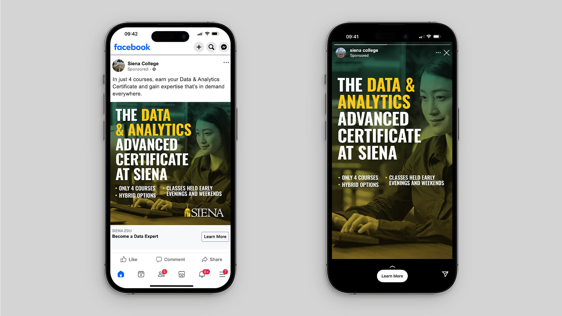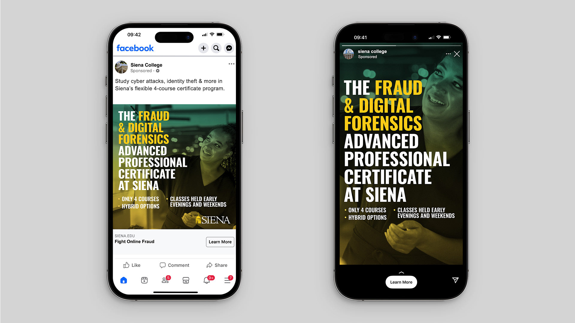 Siena College's 2023 Spring Media Campaign aimed to increase awareness of Siena’s MBA program, advanced certificate in Data & Analytics, and advanced professional certificate in Fraud & Digital Forensics among prospective students and increase application for these programs. I worked on the digital ads including static and animated ads for these programs.