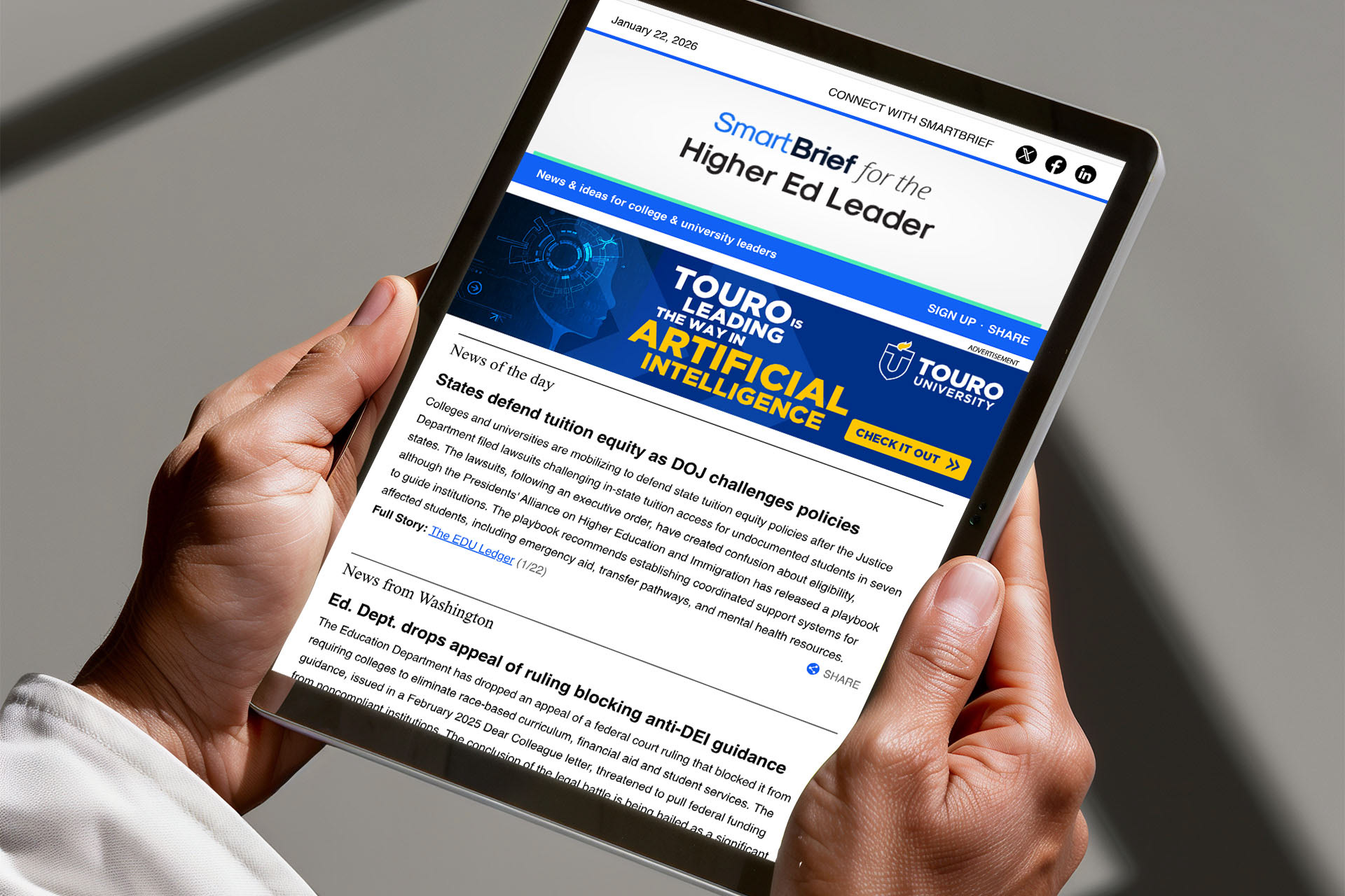 Executed a sponsored content campaign to support and improve Touro’s peer rankings (U.S. News and World Report). This campaign had the goal to increase general awareness and boost the perception of Touro University to voters in the US News “Best Colleges” poll. This included designing ads to be used in the Smart Brief newsletter.