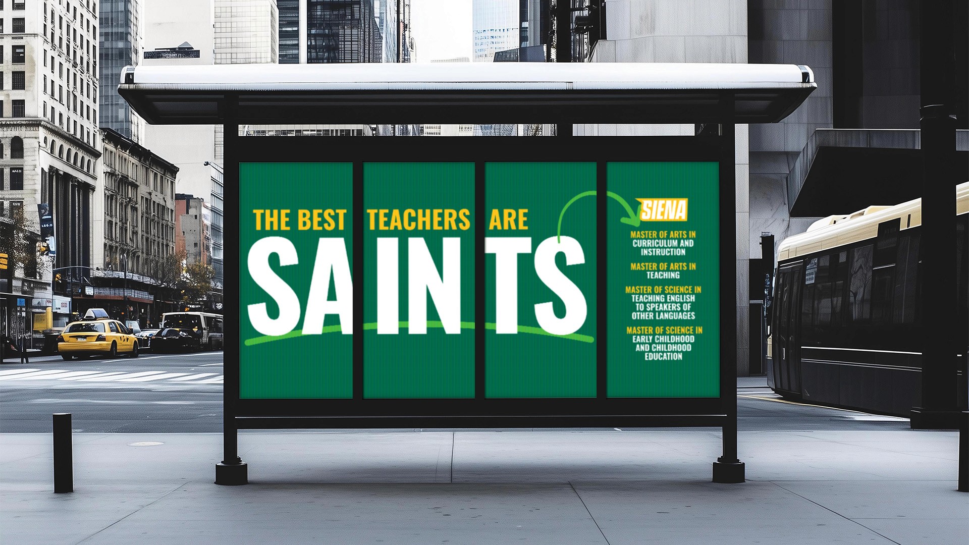 Visual branding for Siena College including an updated bus shelter ad we worked on for their graduate teacher education program, and retractable banners for upcoming receptions and potential open house events.
